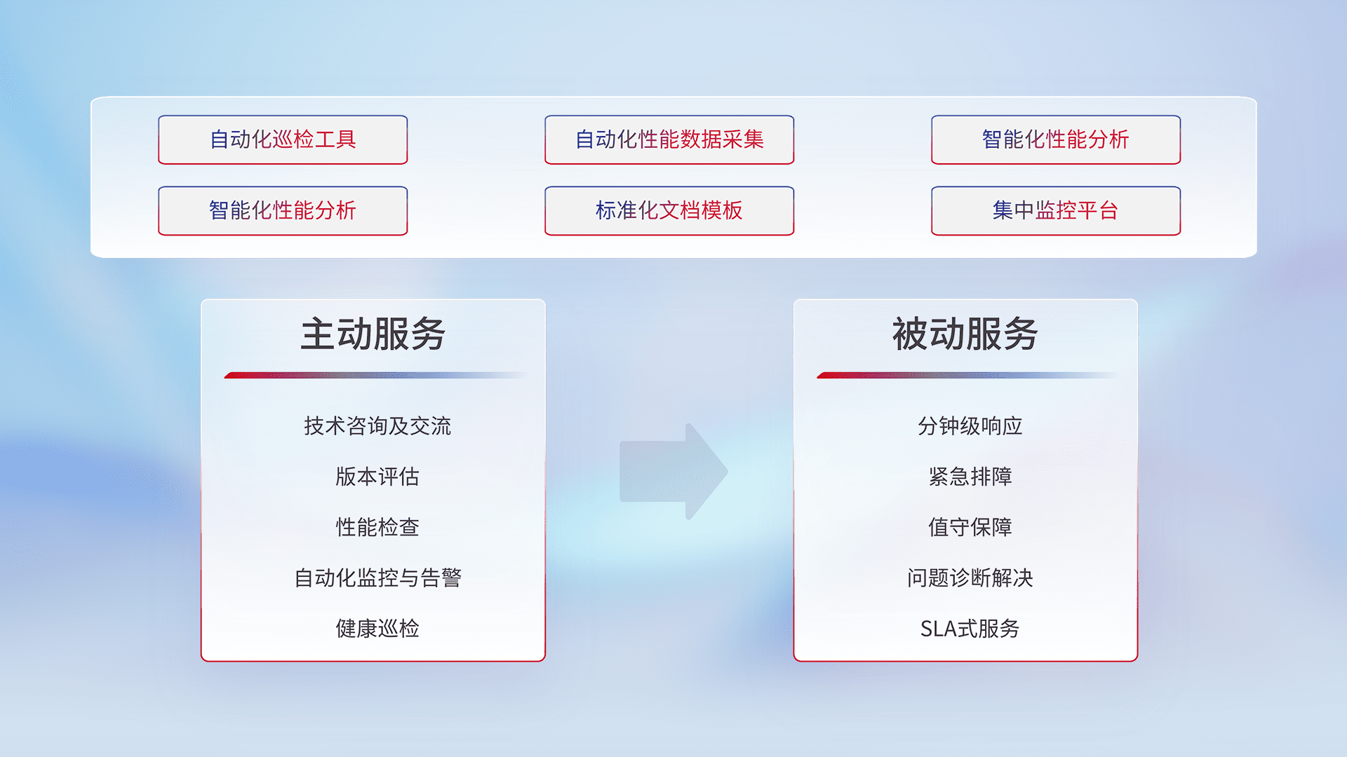 智能化工具和标准化文档,,,,保障服务质量,,提供主动服务(包含技术咨询、、、版本评估、、性能检查、、、自动化监控与告警、、、健康巡检)和被动服务包含(分钟级响应、、、紧急排障、、、、值守保障、、、问题诊断解决、、SLA服务)。。。。